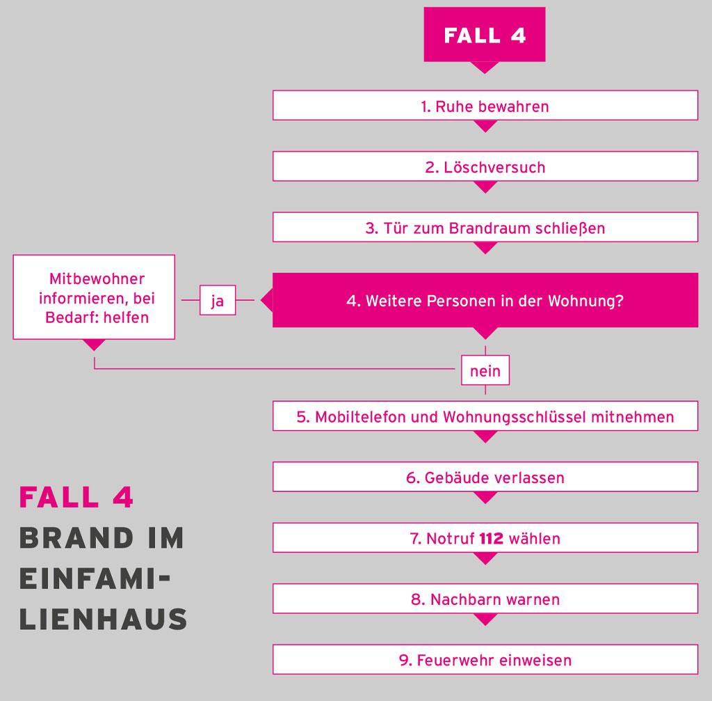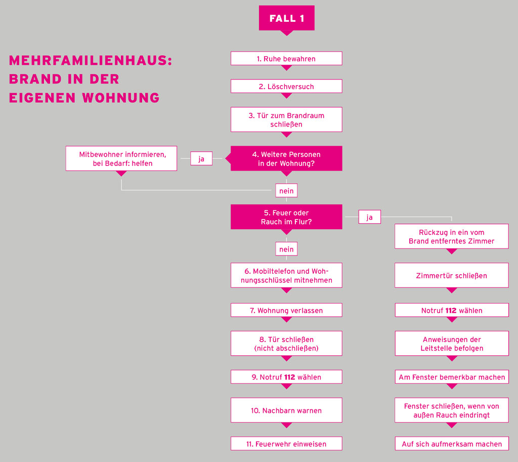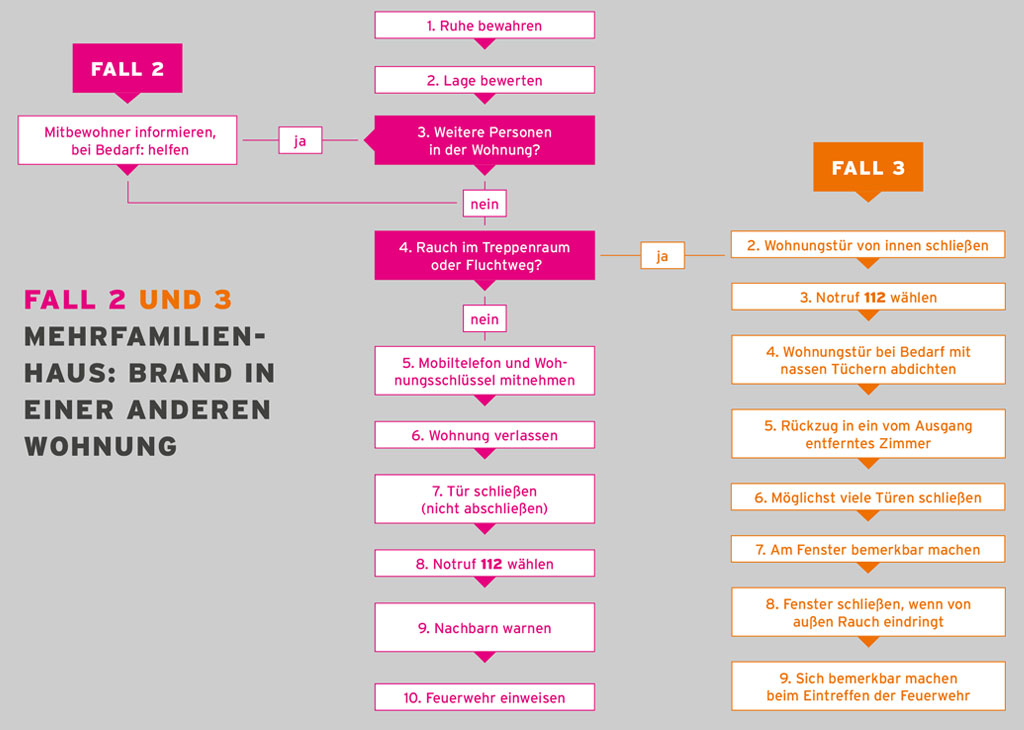 In der Fachempfehlung wird festgestellt, dass das richtige Verhalten im Brandfall stark von der Wohnsituation der Betroffenen abhängt. Das Verhalten im Brandfall in einem Mehrfamilienhaus unterscheidet sich in einigen Details von dem in einem Einfamilienhaus. Daher ist diese Fachempfehlung strukturiert in Verhaltenshinweise für Mehrfamilienhäuser und Einfamilienhäuser.