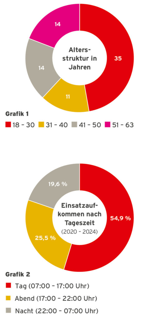 Die Feuerwehr in Schwalbach kämpft – wie viele andere – mit stetig steigenden Einsatzzahlen und Anforderungen. Hinzu kommt ein Feuerwehrhaus, das den heutigen Ansprüchen nicht mehr gewachsen ist. Ein weiteres Problem: Ein Großteil der Einsatzkräfte arbeitet tagsüber außerhalb der Stadtgrenzen. Dies reduziert die sofortige Verfügbarkeit für den Tagesalarm. Insgesamt ist sie als Feuerwehr aber personell gut aufgestellt, wobei die Altersgruppe bis 30 Jahre die größte und aktivste Teilgruppe der Mannschaft darstellt (Grafik 1).