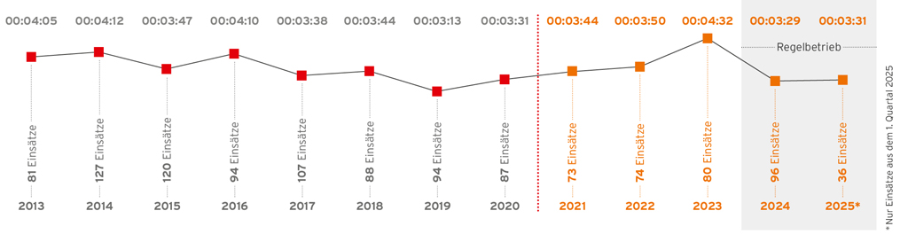 Eine Auswertung der tagsüber (Mo–Fr, 07:00 – 17:00 Uhr) erfolgten Einsätze in den letzten fünf Jahren zeigt, dass die durchschnittliche Zeit bis zum Ausrücken des ersten Fahrzeugs in den Jahren 2024 und 2025 um 20 bis 30 Sekunden niedriger lag als in den Jahren 2021 bis 2023. Eine Langzeitanalyse über zehn Jahre bestätigt, dass die durchschnittliche Ausrückzeit in 2024/2025 bei 3:30 Minuten lag, gegenüber 3:51 Minuten im Zeitraum 2013 bis 2023 (Grafik 4). Obwohl die Auswertung zeigt, dass seit der Einführung der Coworking-Fläche eine Verbesserung der Ausrückzeiten eingetreten ist, ist es schwierig, eine belastbare, monokausale Aussage zu treffen, da die Ausrückzeiten historisch starken Schwankungen unterlagen (bis zu 1:20 Minuten Differenz zwischen einzelnen Jahren). Die Verfügbarkeit zusätzlichen Personals im Feuerwehrhaus ist aber sicherlich ein begünstigender Faktor.