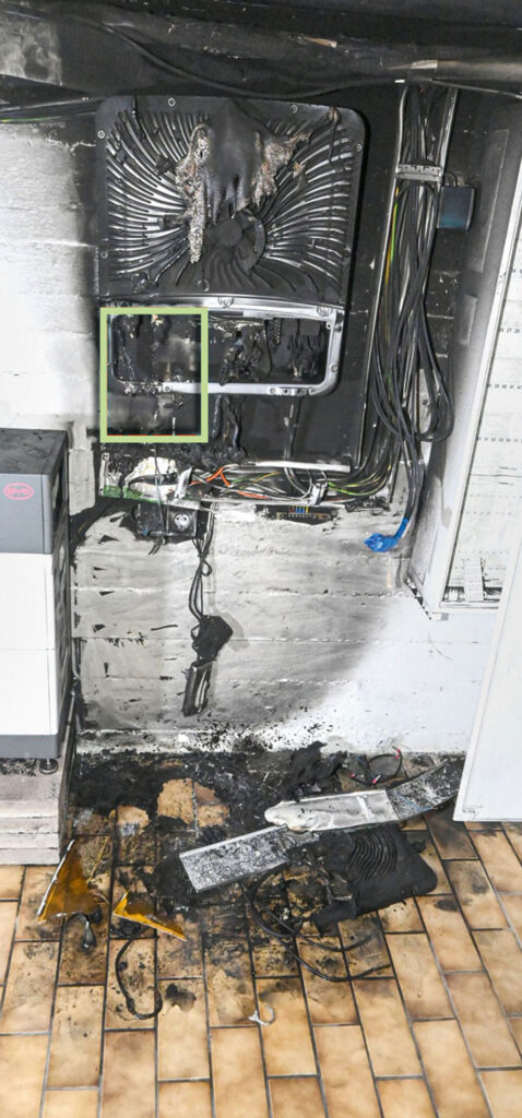 Dieses Problem schien zunächst nicht allzu dringend, doch zwei Tage später zeigte die Überwachungskamera im Keller Rauch. Der Mann alarmierte die Feuerwehr und einen Nachbarn. Die Einsatzkräfte konnten den Brand auf den PV-Speicher eingrenzen, und so fand der IFS-Gutachter, der später die Ursache ermitteln sollte, ein klares, beinahe aufgeräumtes Spurenbild vor: Es gab einen deutlichen Brandschwerpunkt im Anschlussbereich des Wechselrichters an den die Gleichstromleitungen der PV-Module angeschlossen waren. Ein Überspannungsschutz, der hier installiert war, wies extreme Schäden im Bereich der Anschlussklemmen auf.
